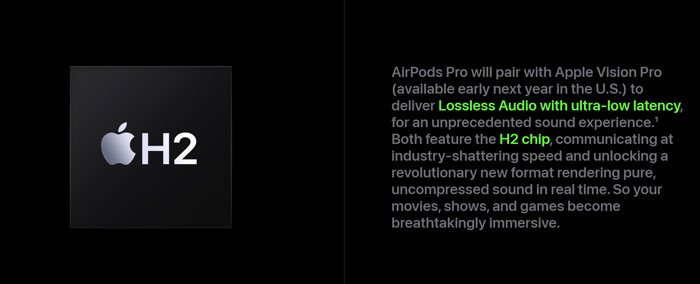 這標(biāo)志著蘋果的無線耳機首次提供無損播放功能。他們在新聞稿中寫道:“AirPods Pro和Apple Vision Pro中的H2芯片,結(jié)合開創(chuàng)性的無線音頻協(xié)議,這解鎖了強大的20位/48 kHz無損音頻,大大減少了音頻延遲。”。