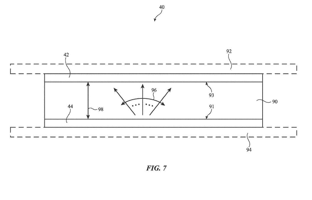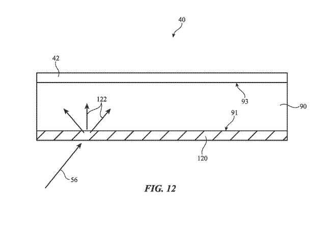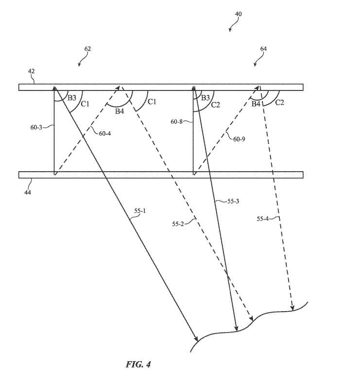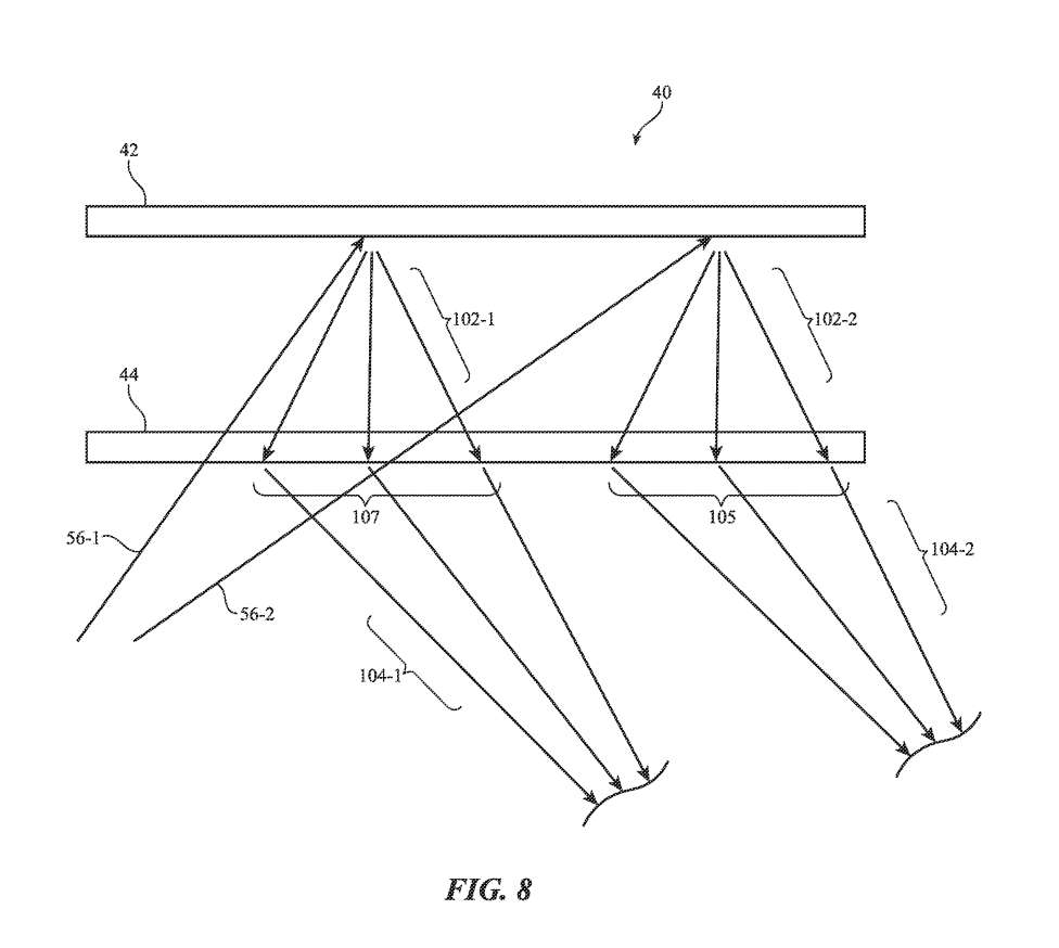蘋果指出,這種方式配置的顯示系統(tǒng)20可以實(shí)現(xiàn)最小的尺寸、重量和功耗(相對于使用半反射組合器的場景),同時顯示相對較大的視場(相對于使用波導(dǎo)組合器的場景)。類似地,在透射全息圖結(jié)構(gòu)44和反射全息圖結(jié)構(gòu)42之間不存在波導(dǎo)可以提供多層全息組合器40的幾何設(shè)計(jì)自由。
