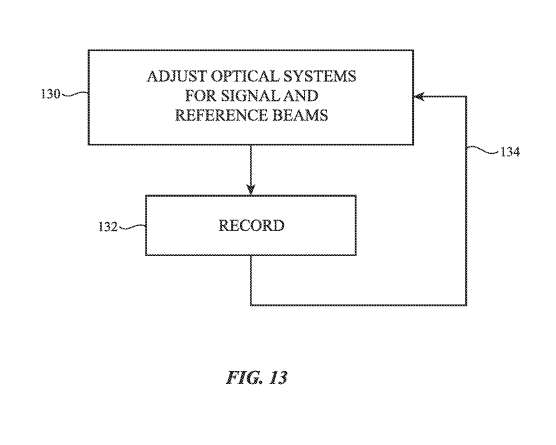 在130的操作過程中,識別出所需調(diào)整的每個設(shè)置并且相應(yīng)地調(diào)整系統(tǒng)組件后,控制器可以指示光源產(chǎn)生光。所產(chǎn)生的光被分割成參考光束和信號光束,并引導(dǎo)到全息記錄介質(zhì)中,以在132的操作期間記錄全息圖。
