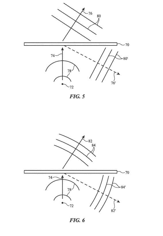 在介質(zhì)70記錄點(diǎn)到近平面波反射全息圖的場景中,點(diǎn)到近平面波反射全息圖將入射光衍射成與入射光在介質(zhì)70同側(cè)的輸出角,如箭頭82′所示。衍射光呈現(xiàn)近平行波前84 ‘。當(dāng)以這種方式配置時,全息圖本身顯示出optical power。