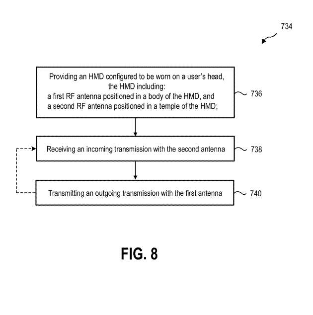 在736,將頭顯定位在用戶頭上。如本文所述,主體中的第一RF天線可以位于所述主體的下邊緣,或位于所述主體的外側。