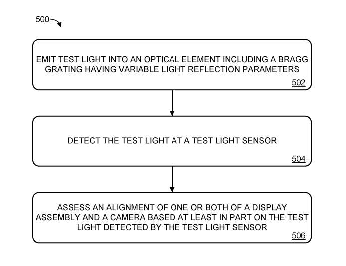 圖5所示的方法500說明了用于頭顯校準評估方法500,其中一個或多個應變片包括在光學元件形成的布拉格光柵。