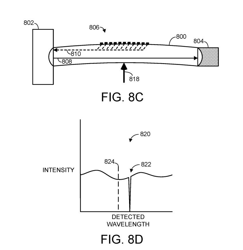 這可以通過測試光傳感器檢測到,如圖8D所示。具體地說,圖8D的圖820顯示了用于圖8C所示場景的由測試光傳感器804檢測的測試光的波長的相對強度。如上所述,測試光傳感器804位于所述測試光的光路的源遠端,因此所述返回的波長由所述檢測波長光譜中的波長谷822表示。