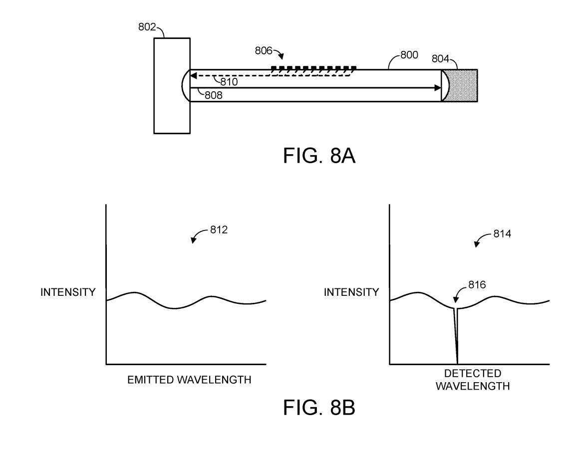 圖8A示出的光學元件800可以采取波導的形式。光學元件800耦合到配置為向光學元件發射測試光的測試光源802,以及配置為檢測來自光學元件的測試光的測試光傳感器804。另外,在測試光源和測試光傳感器之間的光學元件形成布拉格光柵806,光柵806表示為設置在光學元件側面的多個單獨光柵元件。