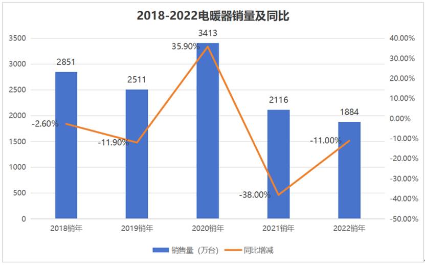 一方面,電暖器作為一個(gè)“靠天吃飯”的傳統(tǒng)產(chǎn)業(yè),經(jīng)過幾十年的發(fā)展,市場(chǎng)早已進(jìn)入飽和狀態(tài)。從2018銷年到2022銷年的數(shù)據(jù)來看,除了2020銷年受低溫天氣以及直播熱潮的影響,電暖器市場(chǎng)出現(xiàn)短暫的回暖之外,其余年份市場(chǎng)均處于下滑態(tài)勢(shì)。剛剛過去的2022銷年(2022.9-2023.3),電暖器市場(chǎng)零售額僅為51.1億元,相較于2020年的92.3億元已接近腰斬。