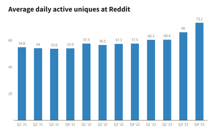 但摩根大通相關報告指出,截至2023年Q4,Reddit的基礎用戶為7300萬。即使2026年DAU能增加到1.09億,但和Meta、Facebook、X等社交APP相比,仍存在較大差異。基于此,高盛和摩根大通分別給予“中性”評級和40美元和47美元的目標價。