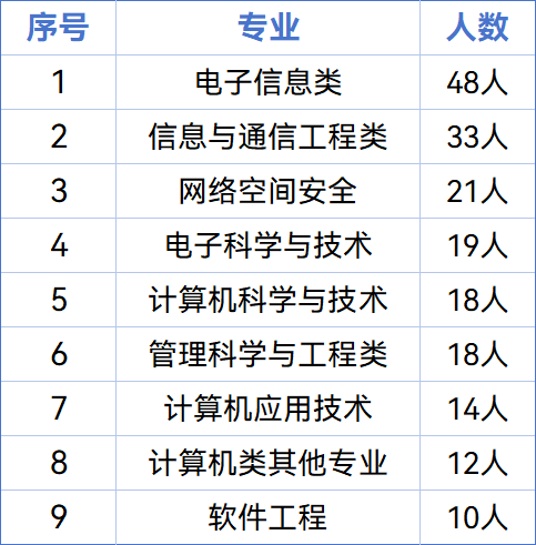 此外,電子信息類、信息與通信工程類、網絡空間安全、電子科學與技術、計算機科學與技術、管理科學與工程類、計算機應用技術、計算機類其他專業、軟件工程等9大專業的招聘人數已經達到193人,占比達60%。