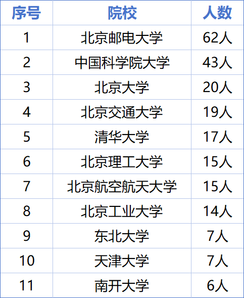 從畢業院校看,北京郵電大學等11所大學共招聘225人,所占比例超過70%。北京大學20人、清華大學19人,清北比例超過12%。