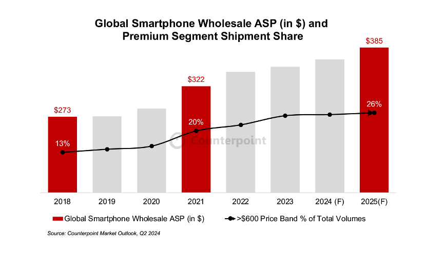 同時,全球智能手機平均售價正在持續上漲。2024年同比增長3%,達到365美元,2025年更將進一步增長5%。這一系列數據清晰表明,智能手機市場的高端化趨勢不僅是消費升級的體現,更是生成式AI推動行業變革的重要。