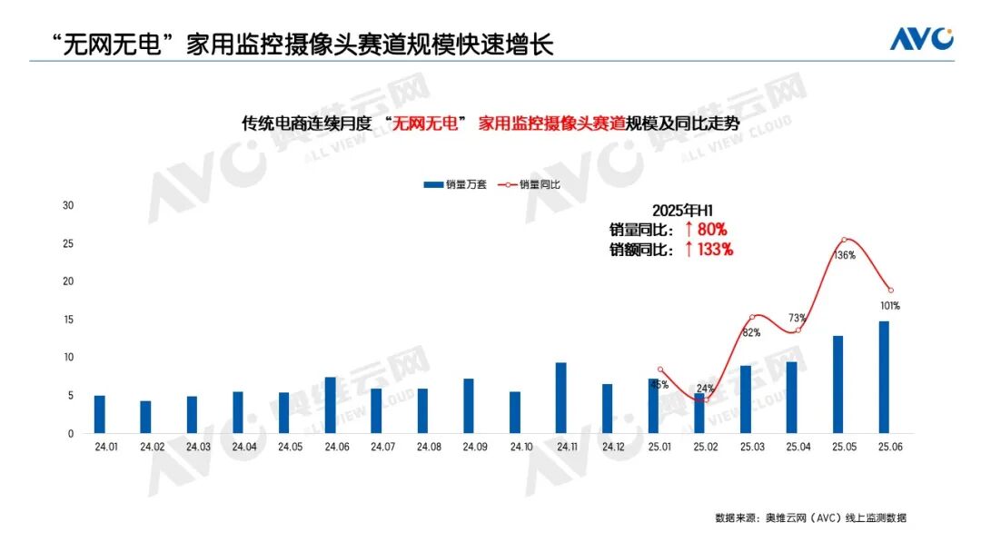 家用監(jiān)控攝像頭在經歷早期的高速普及后,用戶群體已從嘗鮮者逐漸轉向成熟消費者,需求核心也從“有無”轉變?yōu)?ldquo;優(yōu)劣”。消費者不再僅僅關注像素、多攝和視角,而是更加重視設備的綜合使用體驗。近年來,“4G網絡”與“電池供電”兩項技術的融合正在開拓一條全新的賽道。“無網”指內置4G模塊并享受終身免費流量服務,使設備徹底擺脫對Wi-Fi的依賴;而“無電”則通過高性能電池供電技術剪斷了攝像頭的電源線,實現(xiàn)真正的能源無線化。這兩項技術的創(chuàng)新結合讓監(jiān)控攝像頭在連接、供電與安裝三個維度上獲得完全意義上的自由。2025年上半年,家用監(jiān)控攝像頭“無網無電”賽道展現(xiàn)出強勁的發(fā)展勢頭。據(jù)奧維云網(AVC)線上監(jiān)測數(shù)據(jù)(京東、天貓、蘇寧;下同)顯示,2025年上半年無網無電家用攝像頭市場銷量58.4萬套,銷額1.36億元,分別同比增長80%,和133%。