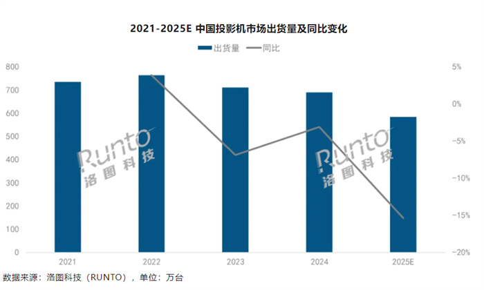 中國智能投影市場正告別過去幾年的高速增長,進入一個以結構性調整為核心特征的新周期。洛圖科技最新數據顯示,中國投影機市場在2022年觸及764萬臺的階段性峰值后,已進入連續兩年的回調期。2024年市場出貨量跌破700萬臺關口至689.3萬臺,預計2025年將進一步下滑至583.4萬臺,同比下降15.4%,市場規模不足600萬臺。